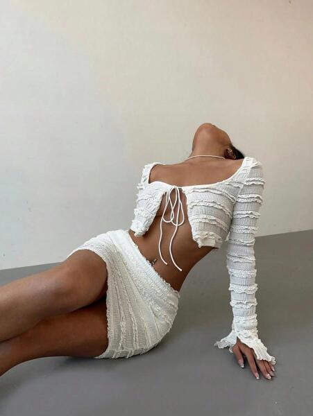 Shein CC52112 Shein Kötött Csipkés Crop Top Hosszú Ujjú (32) S